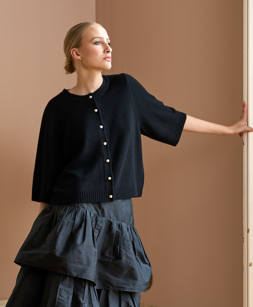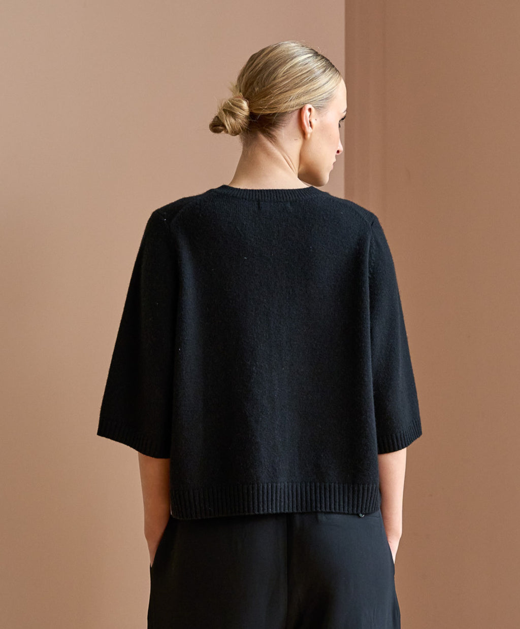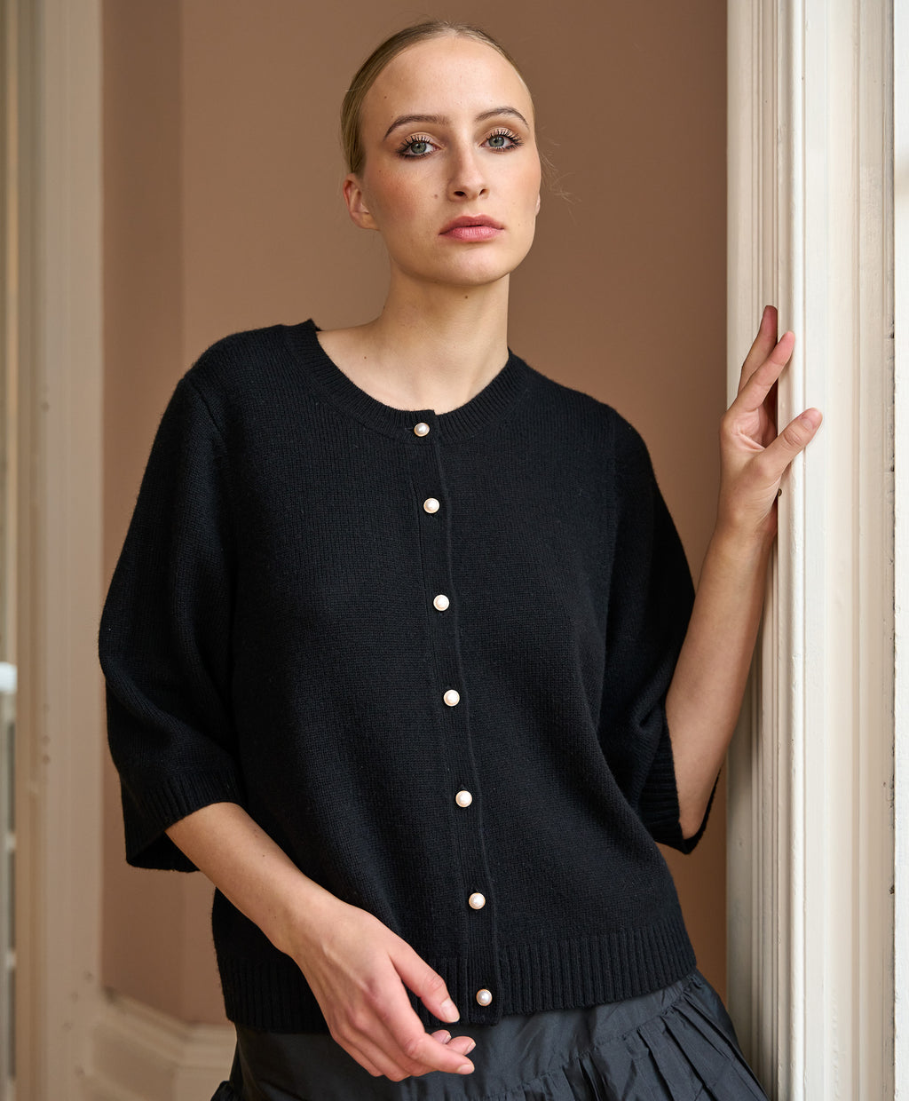 Crafted from a luxurious wool-cashmere blend, The Rosa is soft, lightweight, and effortlessly refined. With delicate button detailing and a relaxed short-sleeve silhouette, it’s a timeless staple for effortless layering.