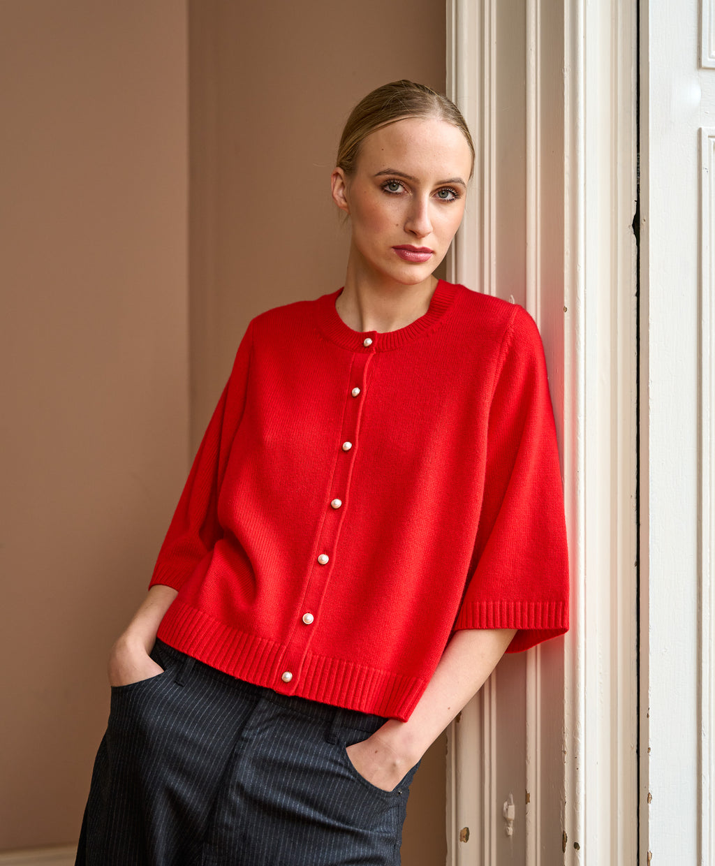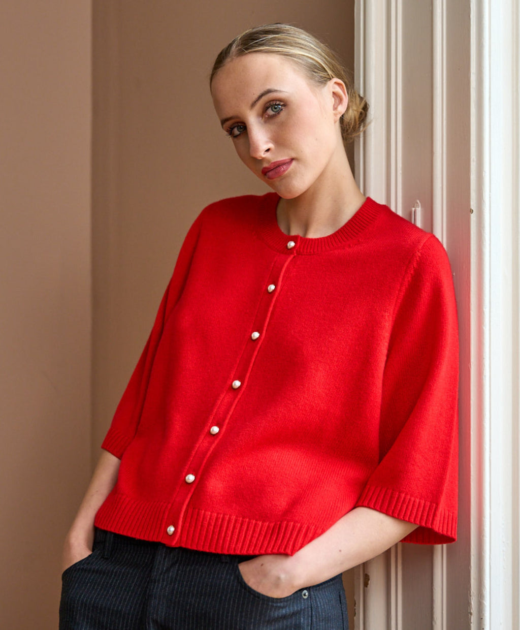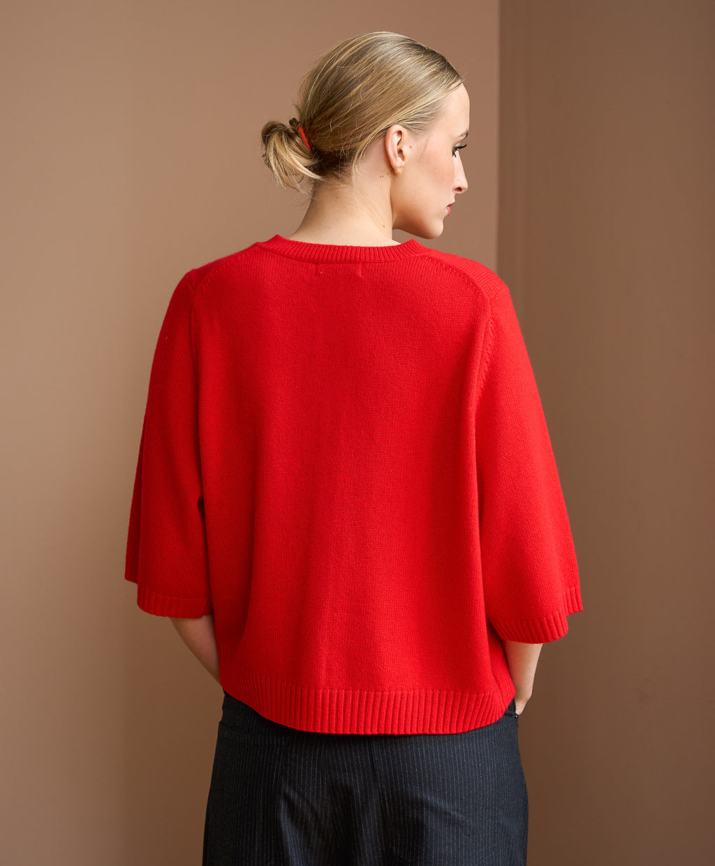Crafted from a luxurious wool-cashmere blend, The Rosa is soft, lightweight, and effortlessly refined. With delicate button detailing and a relaxed short-sleeve silhouette, it’s a timeless staple for effortless layering.