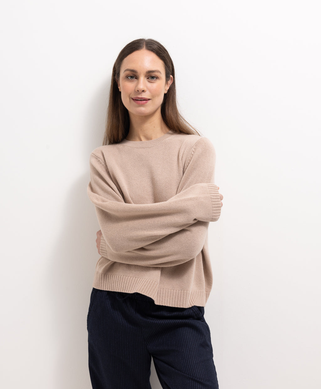 Crafted from a luxurious blend of 70% wool and 30% cashmere, the Maggie Crewneck is softly structured with an easy, relaxed fit. Warm yet lightweight, it drapes beautifully for everyday wear. Finished with a classic crew neckline and clean rib detailing, it’s an effortless staple designed for layering and seasonless styling.