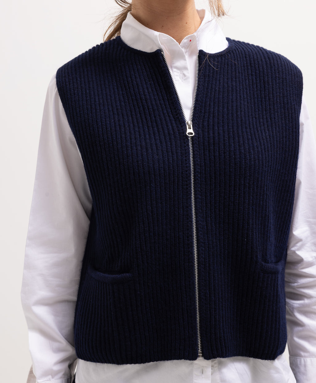 Made from 100% pure merino wool, this zipped gilet is an effortless layering piece. The fine rib knit offers warmth without weight, finished with a clean zip front and practical patch pockets. Designed with an easy silhouette, it layers beautifully over shirts and lightweight knits for everyday wear.