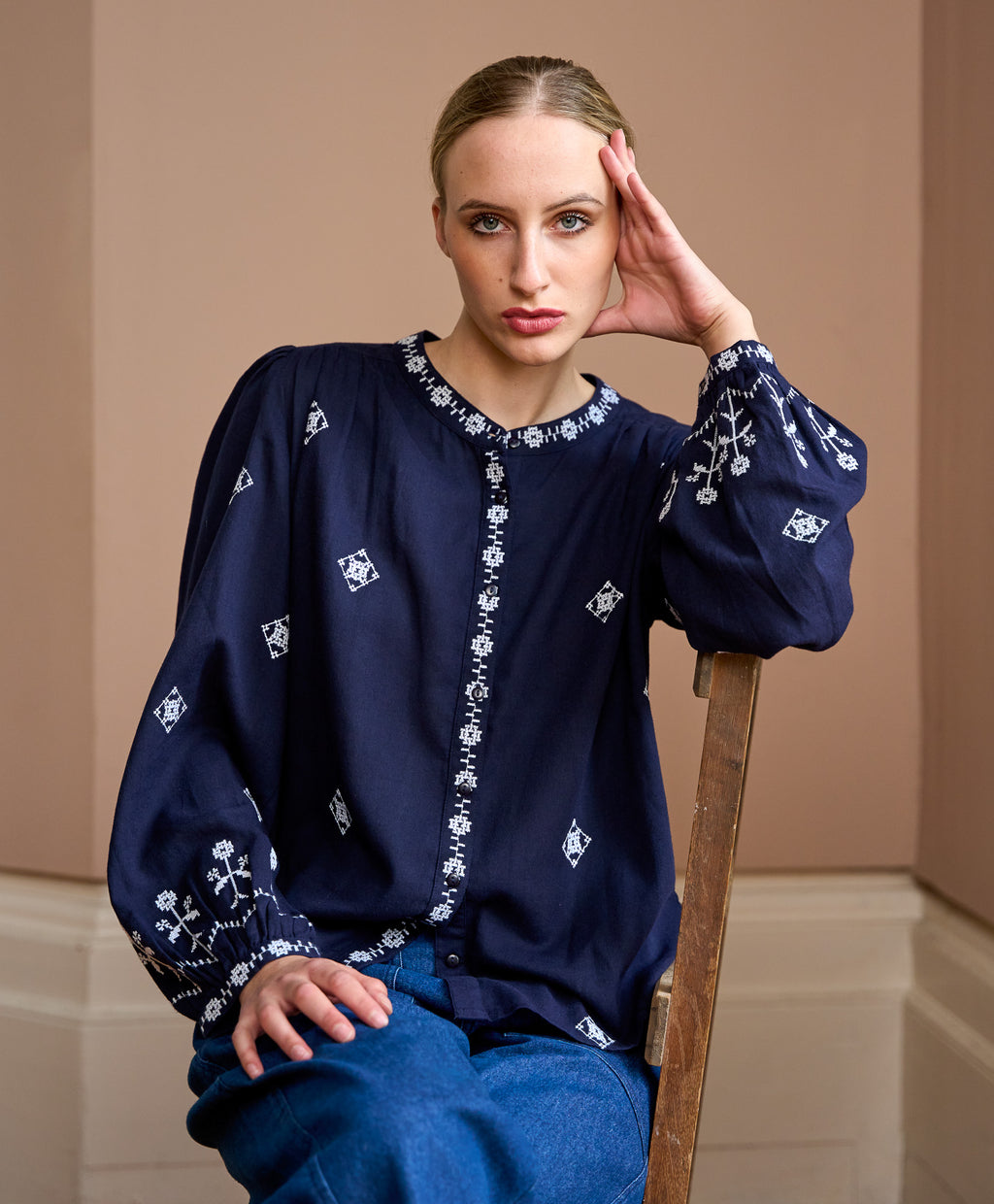The Carole Shirt is defined by its intricate embroidery and timeless silhouette. Crafted in lightweight cotton, it features delicate detailing along the neckline, placket, and sleeves. Gently gathered shoulders and blouson sleeves add soft volume and ease. A versatile piece that brings effortless elegance to everyday dressing.