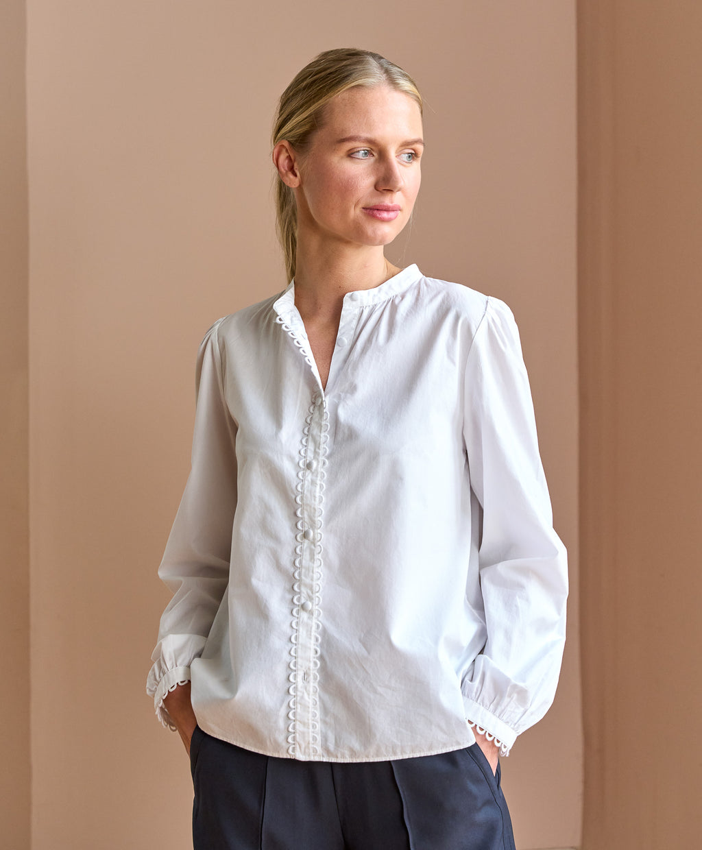 The Holly Shirt is a refined wardrobe classic with feminine detailing. Cut from crisp cotton, it features delicate scalloped trim along the placket and cuffs. A soft stand collar and gathered sleeves lend subtle elegance to its relaxed silhouette. Perfect for effortless day-to-evening dressing.