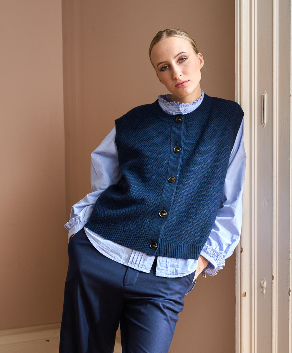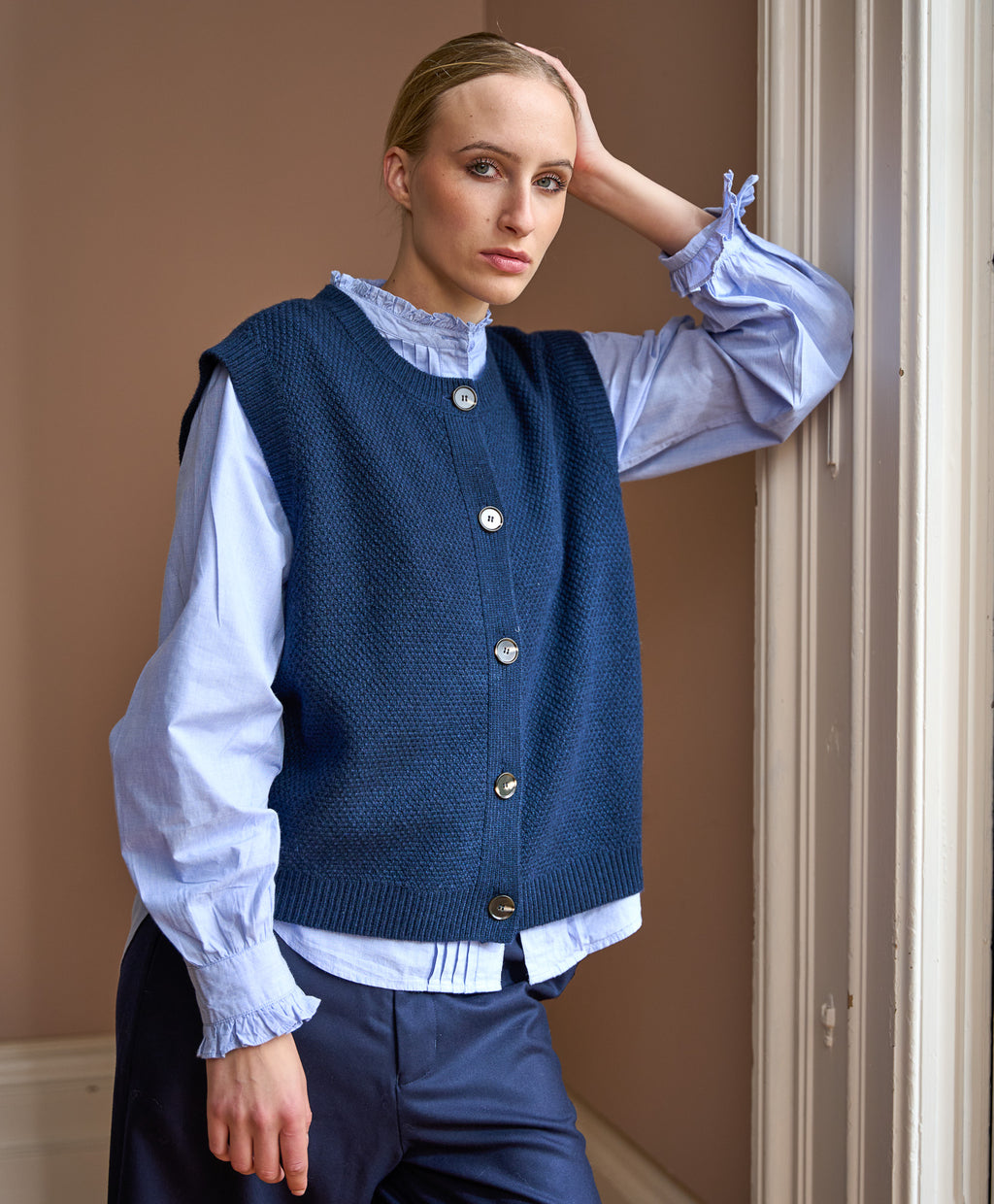 The Brooke is crafted from a luxurious blend of 90% wool and 10% cashmere, offering warmth with a refined softness. Designed in a sleeveless silhouette with a button-through front, it’s perfect for layering over shirts or dresses. Ribbed trims add subtle texture and structure. A versatile knit that transitions effortlessly through the seasons.