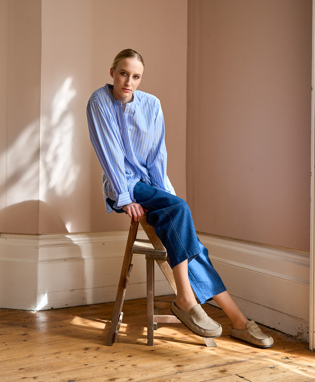 Clothing is wrapped in tissue paper and delivered either in a box or a tough recycled paper bag.