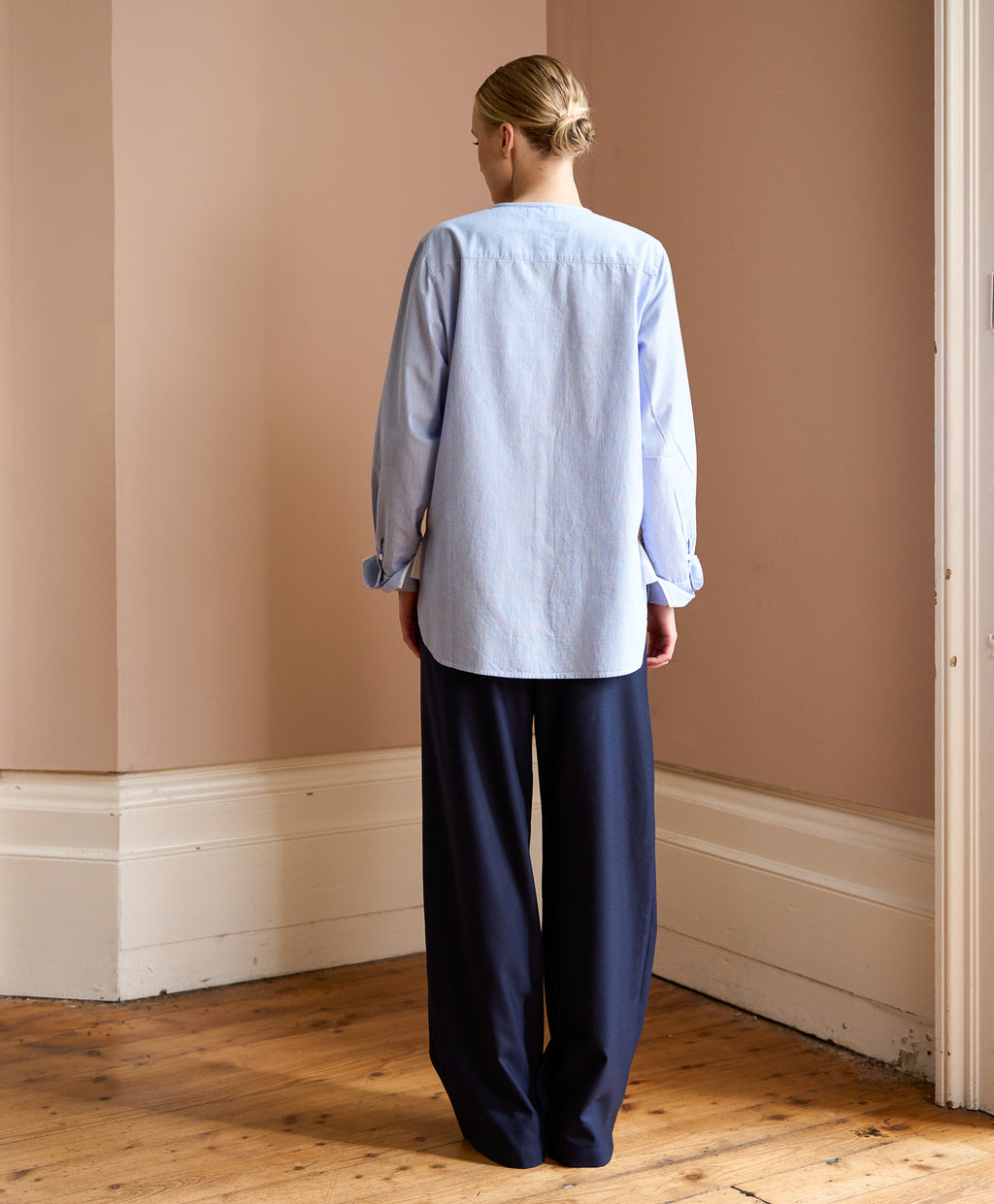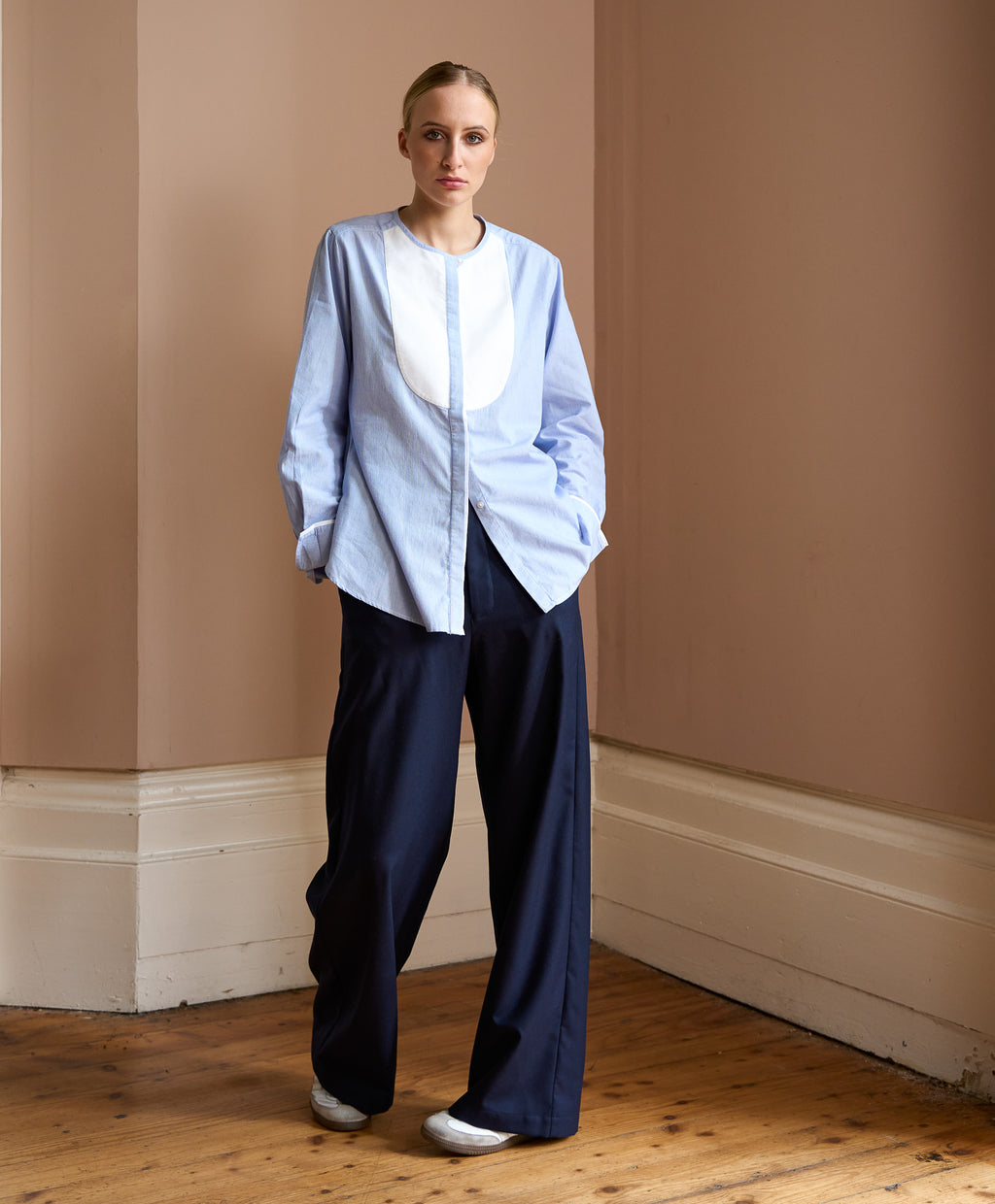 The Striped Bib Shirt is a contemporary reimagining of classic shirting. Crafted from crisp cotton with fine blue stripes, it features a contrasting white bib front that adds sharp detail and modern polish. Designed with a relaxed fit and button-through front, it balances structure and ease, making it an elevated staple for both work and off-duty dressing.