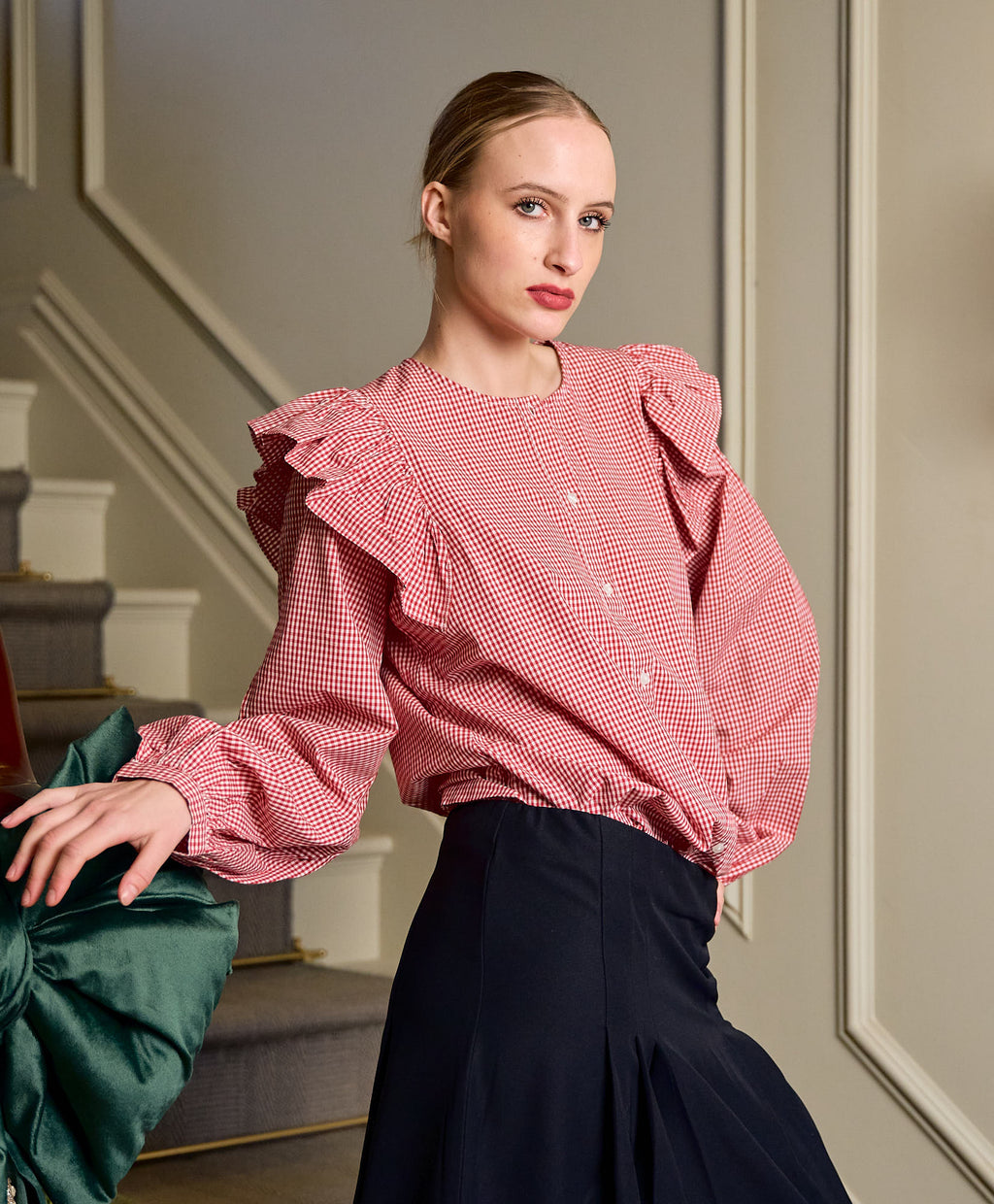 he Henni Shirt is crafted from cotton with a soft, breathable finish. Statement ruffles and voluminous sleeves bring a romantic twist to classic shirting. Its gingham check adds timeless charm with a playful edge. An effortless piece that pairs beautifully with denim or layered under knits.