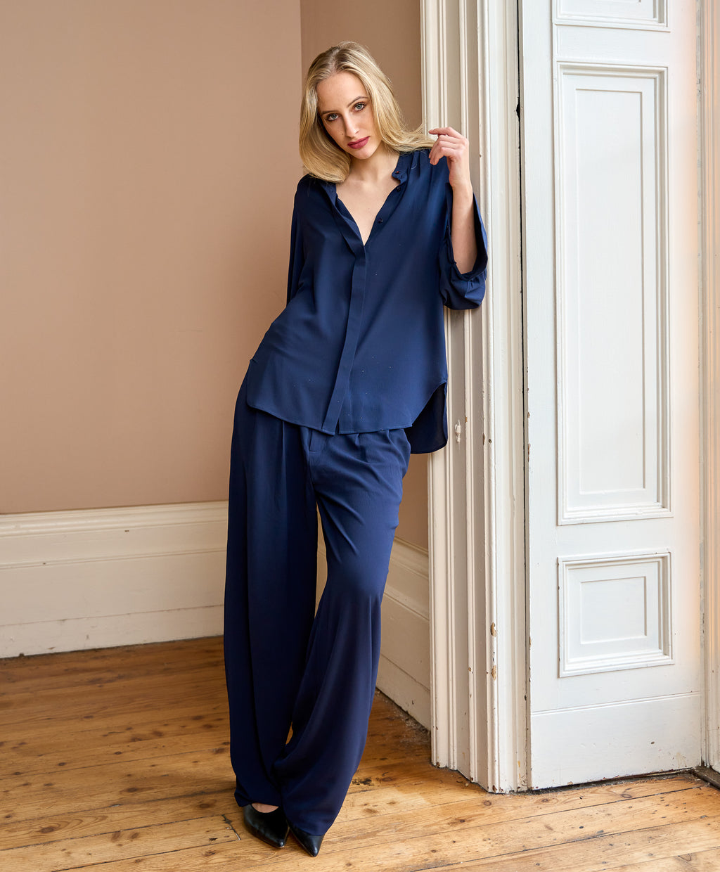The Cleo Pants are the definition of understated elegance. Crafted from fluid jute crepe, they fall beautifully through a relaxed, wide-leg silhouette that moves effortlessly with the body. The soft drape and clean lines create a flattering shape, perfect for both day and evening. Style with a simple shirt or knit for a modern, polished look.
