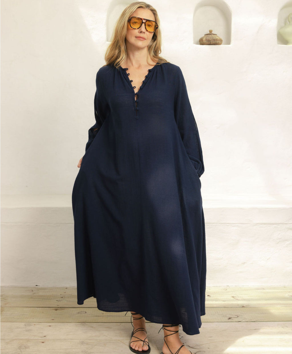 The Amelia Kaftan is crafted from soft, breathable cheesecloth and designed for effortless warm weather dressing. Featuring delicate cut out detailing through the sleeves and an easy flowing silhouette, it offers comfort with a refined, feminine feel. Wear loose or softly belted for relaxed elegance from day to evening.