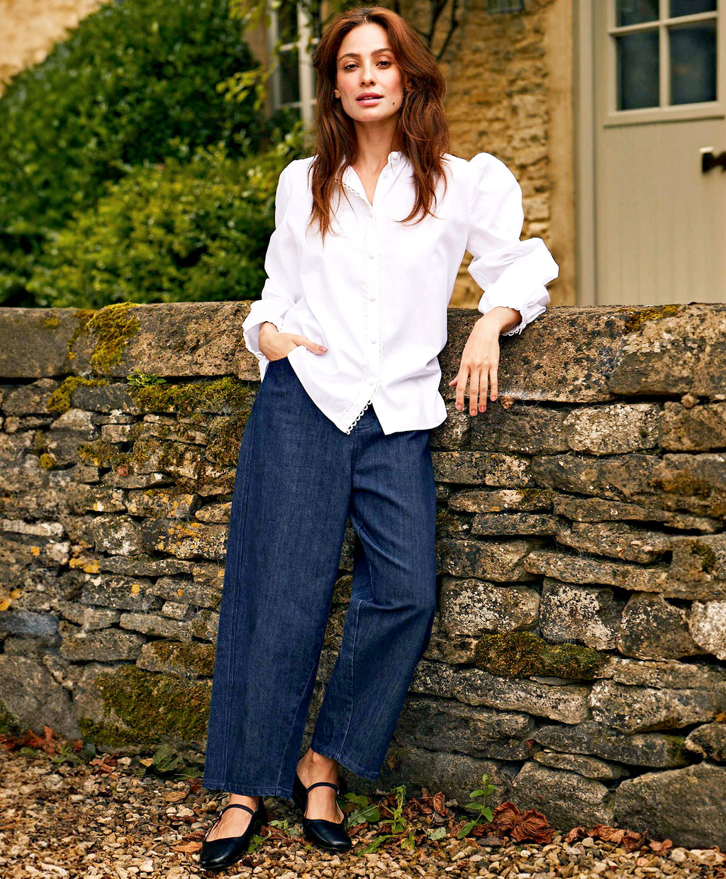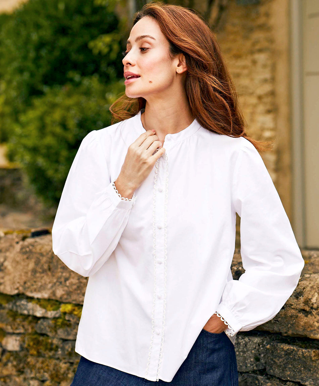 The Holly Shirt is a refined wardrobe classic with feminine detailing. Cut from crisp cotton, it features delicate scalloped trim along the placket and cuffs. A soft stand collar and gathered sleeves lend subtle elegance to its relaxed silhouette. Perfect for effortless day-to-evening dressing.