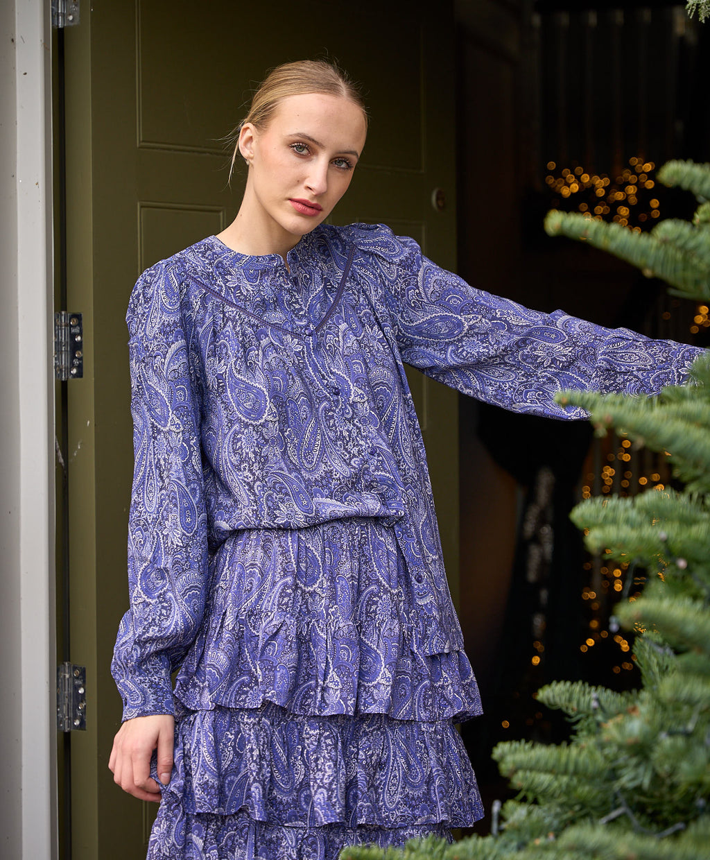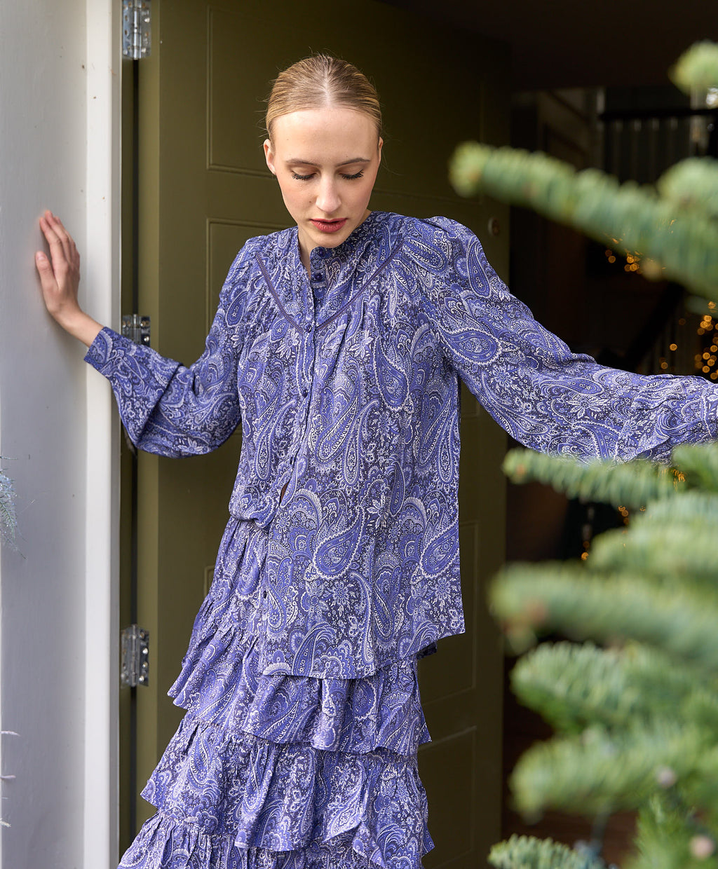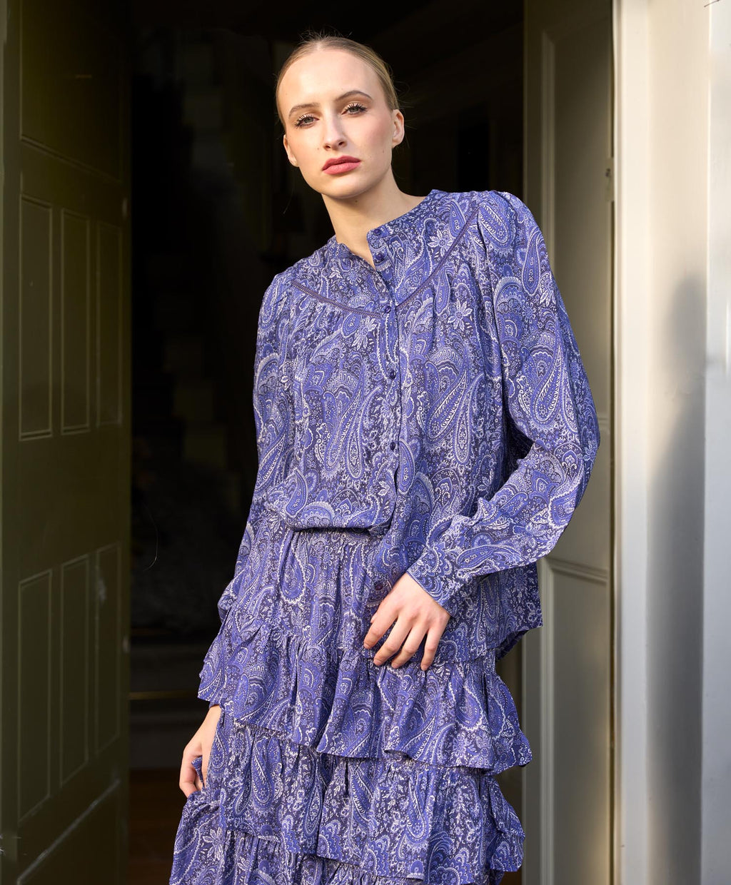The Monica Shirt is a soft, feminine silhouette crafted from lightweight butter crepe. Featuring an intricate paisley pattern, it combines fluid movement with timeless detail. Gentle gathers at the shoulders and cuffs add subtle volume, while the relaxed shape ensures effortless wearability. A beautifully versatile piece that brings easy elegance to every day.