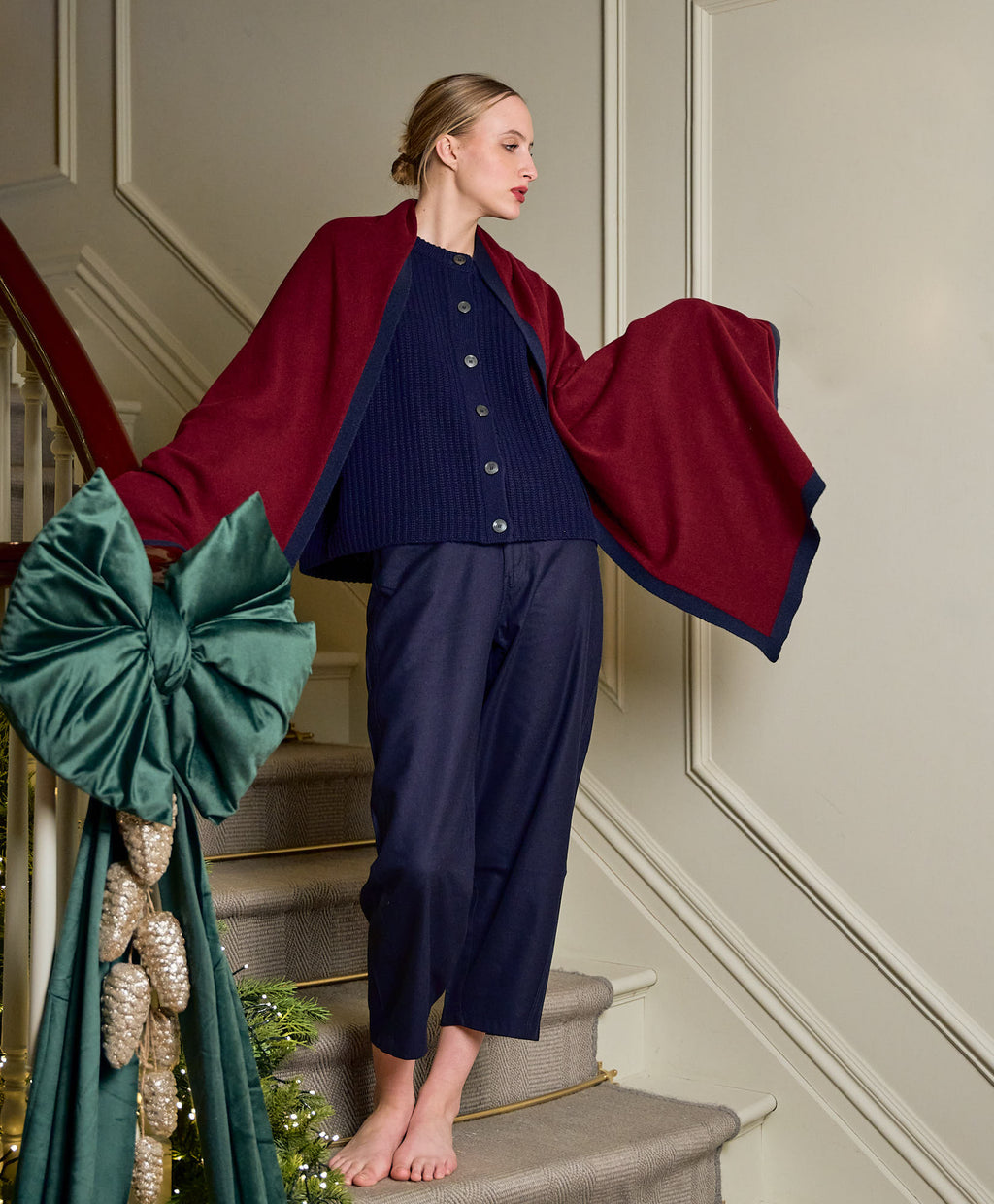 The Sabrina Wrap is the ultimate cold-weather companion, crafted from a luxurious blend of cashmere and wool. Beautifully soft hand feel, warm, elegant , it’s finished with clean contrast edging for a refined touch. Generously sized, it can be worn over outerwear or layered indoors for effortless sophistication. A timeless piece designed for everyday elegance.
